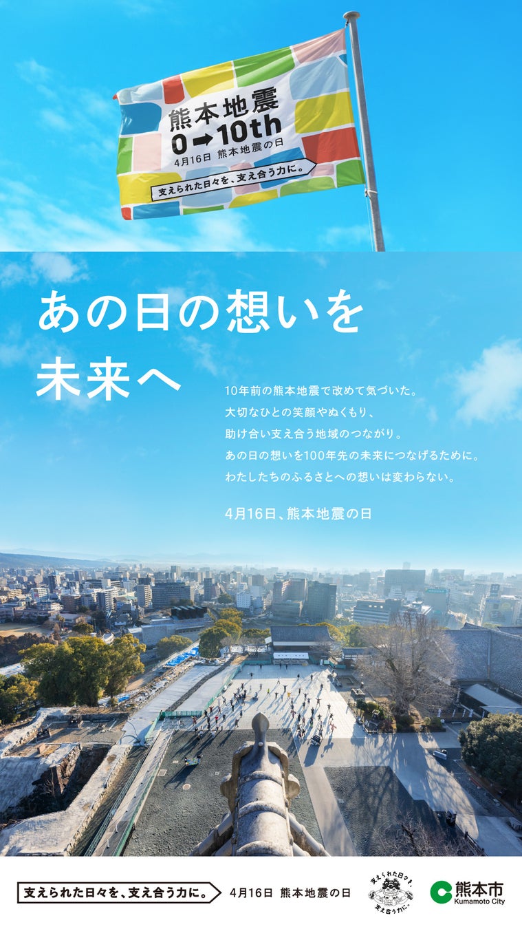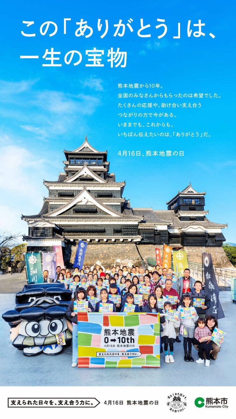 熊本県熊本市(市長:大西 一史)では、平成28年熊本地震の発災から10年という大きな節目を迎えるにあたり、全国に向けてこれまでの支援に対する感謝を伝えるため、公募市民「感謝応援団」参加による普及・啓発広告を制作しました。制作した広告を全国及び市内各地に掲出しますのでお知らせします。