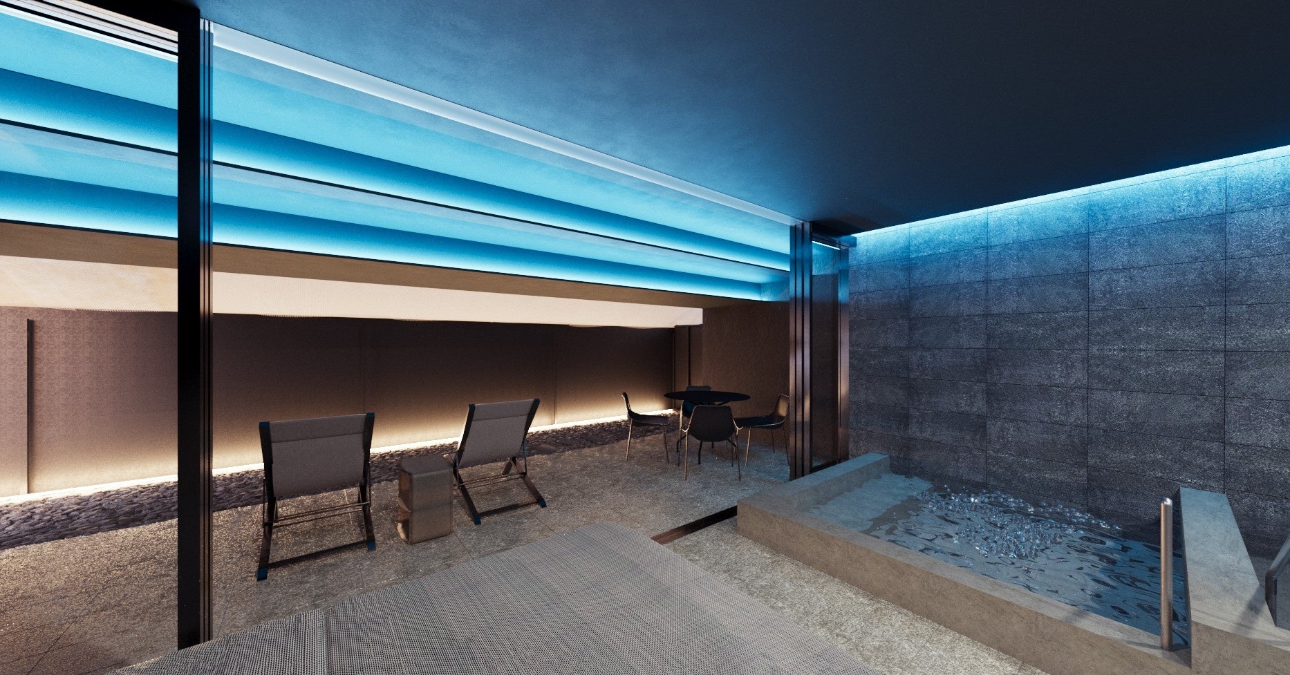 一室は鹿児島のイメージカラー「黒」を基調とし、鹿児島のシンボルである桜島や、鹿児島にゆかりのある偉人西郷隆盛の力強さを感じさせる無骨なソリッドデザイン。もう一室は鹿児島湾をイメージし、ブルーグレーから深い青への美しいグラデーションが特徴的なサウナです。