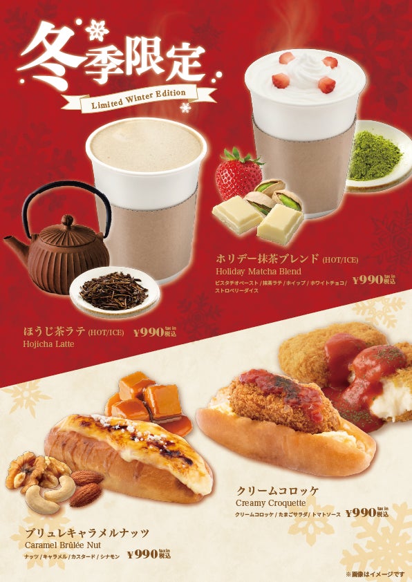 今年の冬は、ほうじ茶ラテを含む全4種の新作がラインナップ。見た目も華やかなデザートドリンクと、ランチにもぴったりなホットミール系あげパンなどどれも体暖まるメニューです。