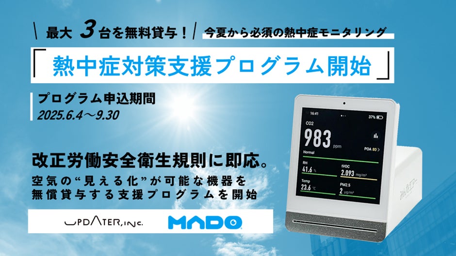 株式会社UPDATER(所在地:東京都世田谷区、代表取締役:大石英司)は、労働環境モニタリングクラウド「MADO(マド)」を活用した熱中症対策支援プログラムを、2025年6月4日(水)から9月30日(火)まで実施します。