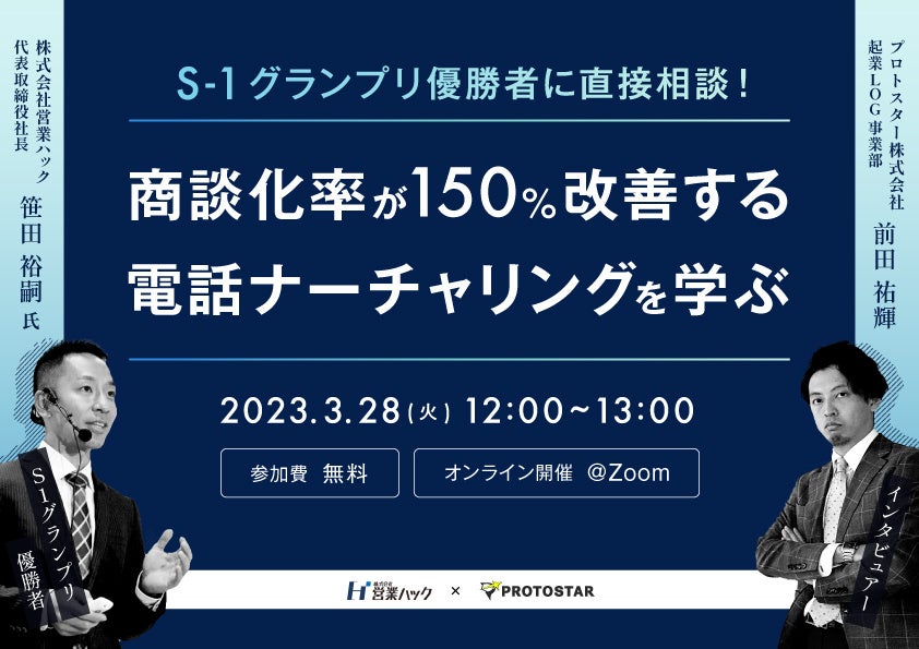 株式会社営業ハック(本社:東京都港区・代表:笹田裕嗣)とプロトスター株式会社(本社:東京都目黒区・代表:前川 英麿)が共催ウェビナーを行います。日時は2023年3月28日(火)12:00~13:00、参加費は無料です。リモートワークやハイブリッドワークの推進に伴い、営業活動のあり方も大きく変わりました。難易度が上がっているともいえる、電話営業・ナーチャリングやテレアポ。ただこのご時世だからこそ、テレアポをやる意義やメリットも存在します。現代ならではのノウハウを詳しく解説していきます!