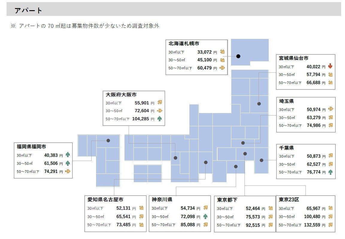 ・コメントでは、30㎡以下を「シングル向き」、30㎡~50㎡以下を「カップル向き」、50㎡~70㎡以下を「ファミリー向き」、70㎡超を「大型ファミリー向き」としています。