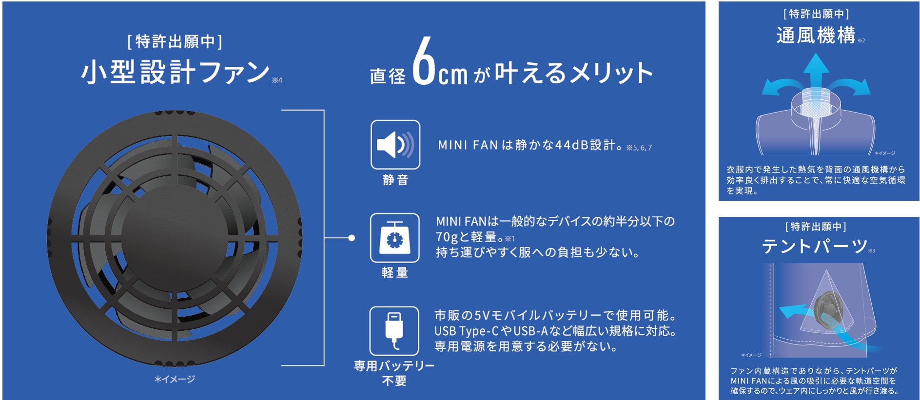 ファンを小型化を実現した上で、静音・軽量・省エネの3点を高いレベルで実現。