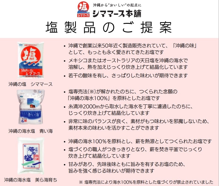 ノボテル沖縄那覇(那覇市:坂本 公敏総支配人)では前川守晃 総料理長の監修のもと、沖縄の老舗塩メーカー、シママース本舗(糸満市:又吉 元榮社長)とのコラボレーション商品の販売と提供を始めます。