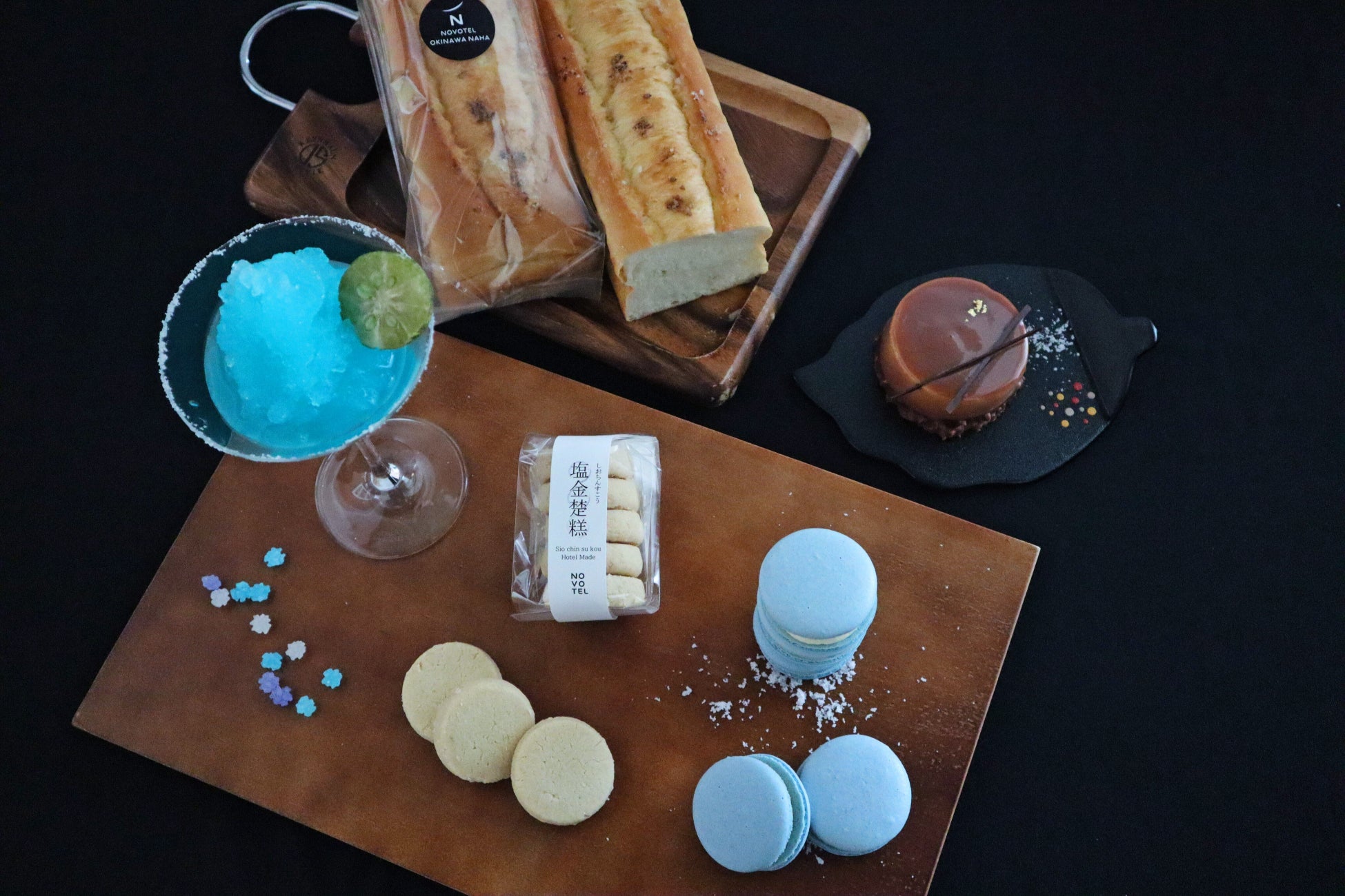 「沖縄から“おいしい”の起点に」をテーマに、沖縄の本土復帰間も無く開業したシママース本舗 株式会社 青い海が製造する 3 商品「美ら海育ち」「シママース」「青い海」を使い、ホテルメイドブレッド、マカロン、ちんすこう、ケーキ、カクテルの 5 種類の商品に展開。 中でも、沖縄・糸満沖合約 2,000m の海水を汲み上げて濃縮し薪の炎でじっくりと炊き上げて作られた「美ら海育ち」は、単調な塩味だけではなくほのかな甘みが特徴。その「美ら海育ち」を使ったホテルメイド「塩金楚糕(しおちんすこう)」は、お土産としてもおすすめの商品。ノボテル沖縄那覇の、ほろりとした食感と甘味と塩味の余韻が残る「塩金楚糕(しおちんすこう)」をご自宅へ。この機会に、”マース(沖縄の塩)”に触れてみてはいかがでしょうか。