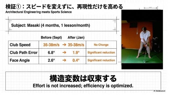 本事業は、個人差(身体特性)に合わせて「力を足す」のではなく、「エネルギー伝達の流れを組み替える」ことを重視します。さらに、技術理解と行動変容を促す設計(タイムテーブルOS)を取り入れ、受講後に自ら練習・改善したくなる状態をつくることを狙います。今後は講師育成とツール(AIボット)による支援で属人性を排し、福岡で確立したモデルを全国へ展開していきます。ゴルフを「健康インフラ」と捉え、離脱者を減らし、健康寿命を伸ばす社会実装に挑戦します。