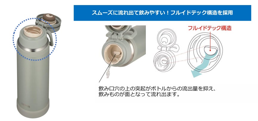 『真空断熱ケータイマグ(JOYシリーズ)』の飲み口に、新構造となる「フルイドテック構造」を採用しました。大容量サイズの水筒で飲みものを飲む場合、中身が多いため水筒を傾けると、一度に多くの飲料が流れ出てしまいます。そのため、大容量サイズの水筒でもスムーズに飲める新しい飲み口の開発に着手し、「フルイドテック構造」を開発。「フルイドテック構造」では、飲み口穴の上に突起を設けているため、水筒を傾けた際の流出量を抑えることで、飲みものが飲み口に沿ってスムーズに“面”で流れる設計です。温冷問わず滑らかな飲み心地を実現しました。