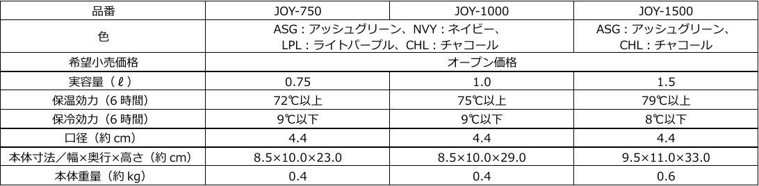 『真空断熱ケータイマグ(JOY-750/1000/1500)』 仕様一覧