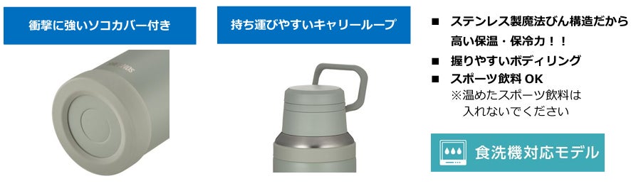 また、持ち運びしやすいキャリーループを搭載し、水筒の底には衝撃に強いソコカバー付き。全パーツ食洗機対応で、毎日のお手入れも簡単です。容量は、0.75L、1.0L、1.5Lの3タイプをご用意。カラーは性別年齢問わず使用しやすいラインアップを取り揃えました。