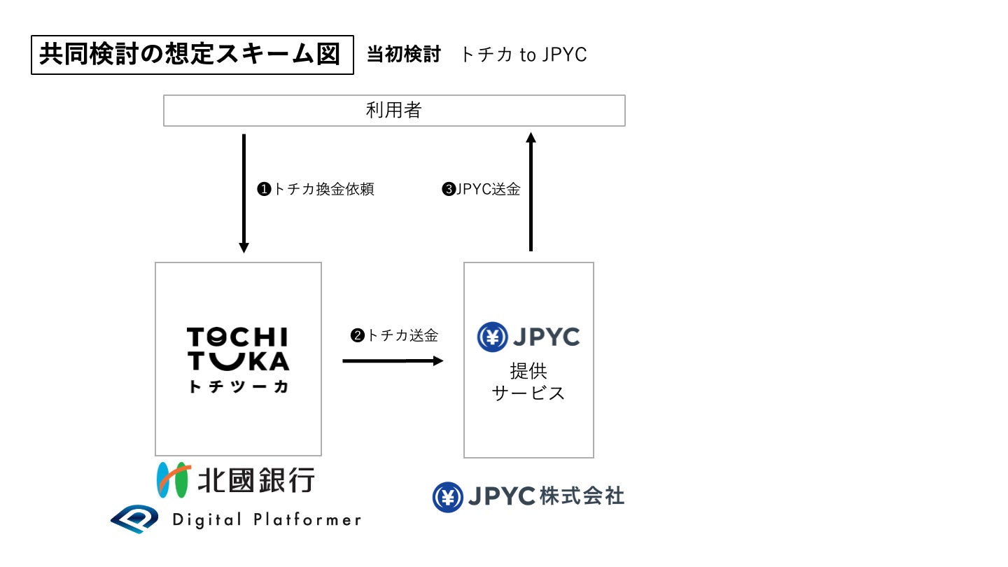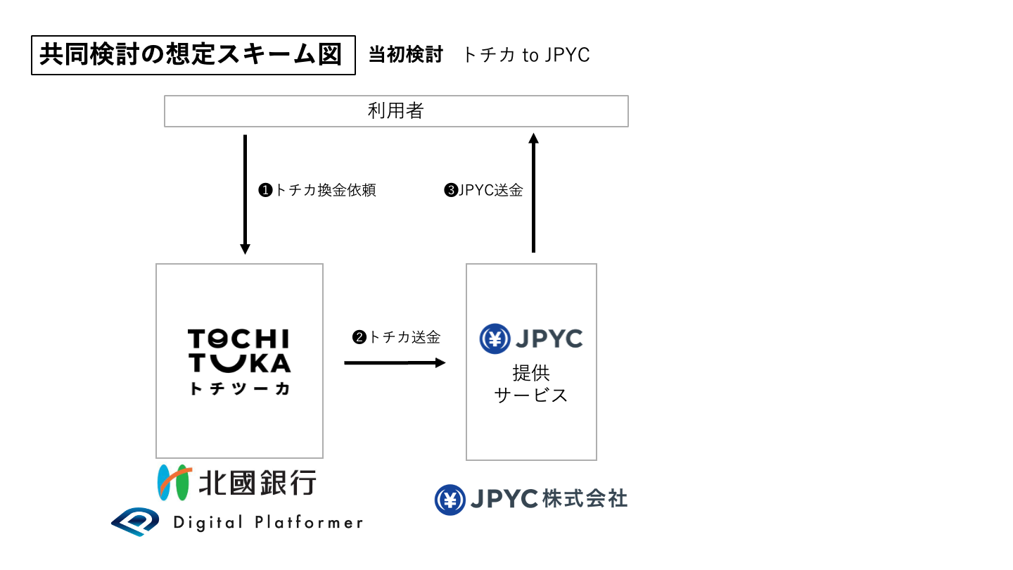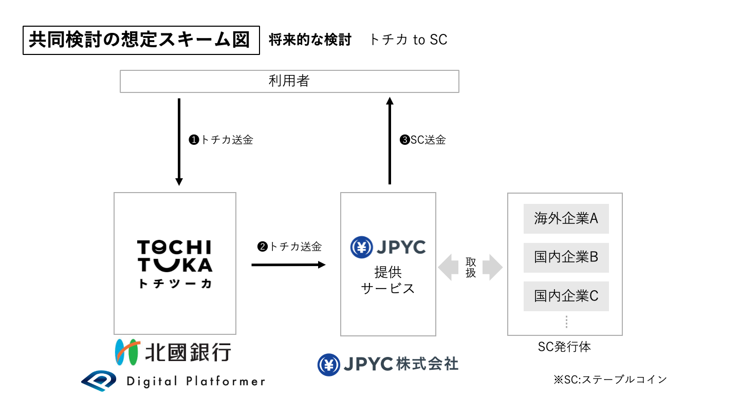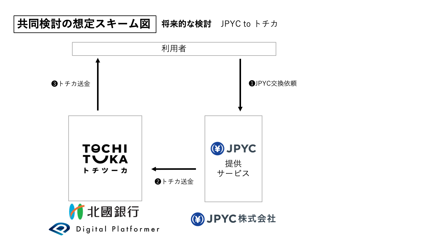 本共同検討は、高い相互互換性を持つブロックチェーン技術におけるステーブルコインの特徴を活かし、それぞれが発行するステーブルコインの相互交換の実現を目指します。まずは「トチカ」から資金移動業型ステーブルコイン「JPYC」への交換を実現することを目指します。預金型ステーブルコインから資金移動業型ステーブルコインへ交換可能になることで、ユーザーはパブリックチェーンへのアクセスが可能となり、利用可能な地域の拡大や、利用用途の増加が見込まれます。