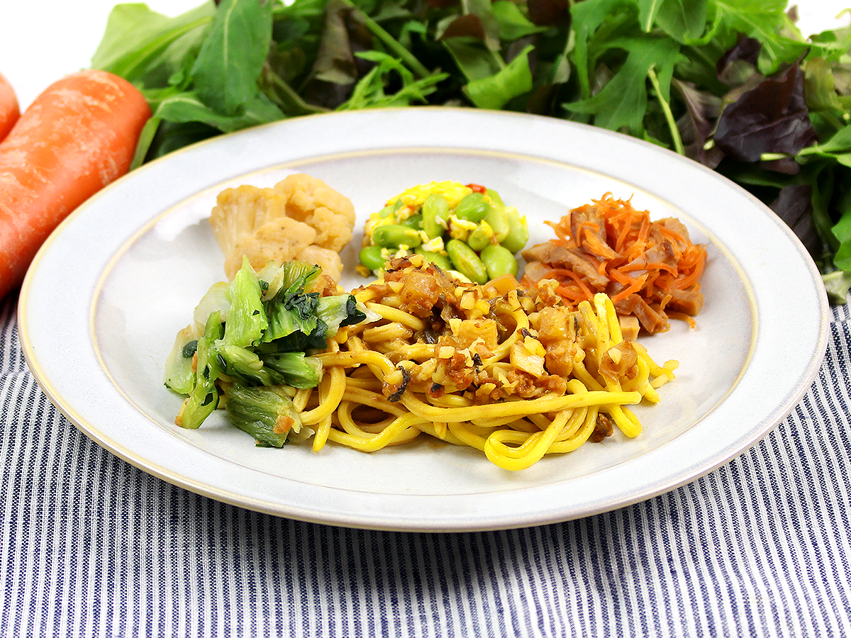 副菜は、カリフラワーの香醋だれ、枝豆を卵と赤パプリカで彩りよく混ぜ合わせた枝豆卵、人参と焼豚のあえ物です。