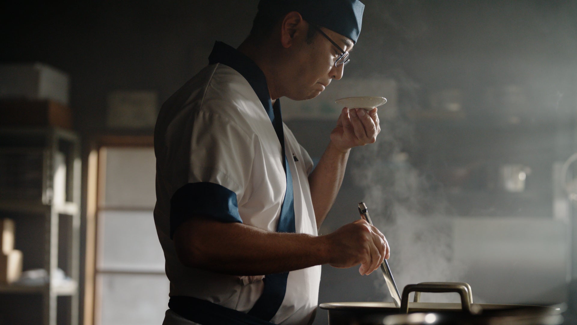 100%国産小麦、塩、水のみから、麺職人が真剣な眼差しで打つうどん。ひとつひとつの工程を麺職人が想いをこめて丁寧に行なっていくカットの後には、だしを引くためのこだわりの素材と、麺職人がだしを味見し自信にあふれる様子が映し出されます。だしが注がれると、立ち上る湯気がだしの香り高さを感じさせるカットになっています。