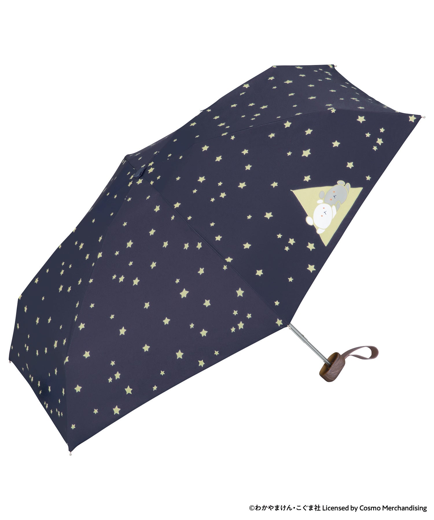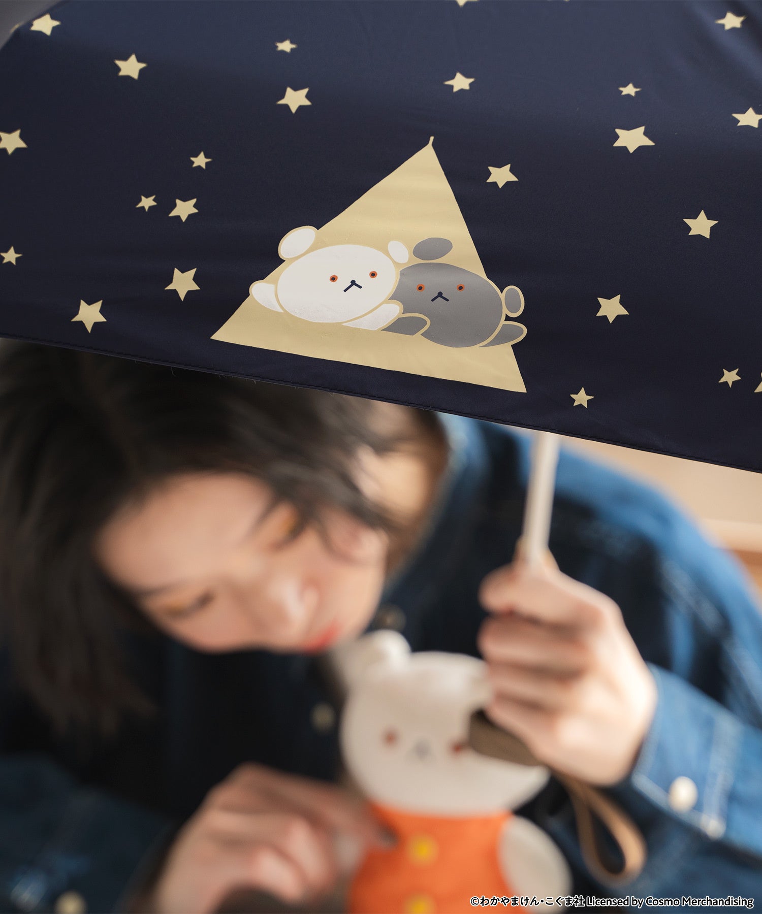 『さよなら さんかく』を題材にした日傘は、夜空を表現したネイビーの生地にきらきらと輝く星をたくさん散りばめました。こぐまちゃんとしろくまちゃんがテントから仲良く星空を見ているシーンは、絵本の物語に入り込んだような気持ちに。