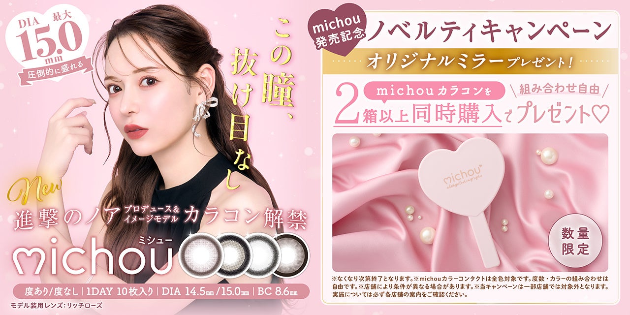 PIA株式会社(本社:東京都品川区 代表取締役:見原 博道)は、日本一有名なキャバクラグループ・エースファクトリーで北新地CLUB REIMS社長の「進撃のノア」がプロデューサー&イメージモデルを務めるカラーコンタクトレンズ新ブランド『michou(ミシュー)』を本日3月31日(月)より発売いたします。