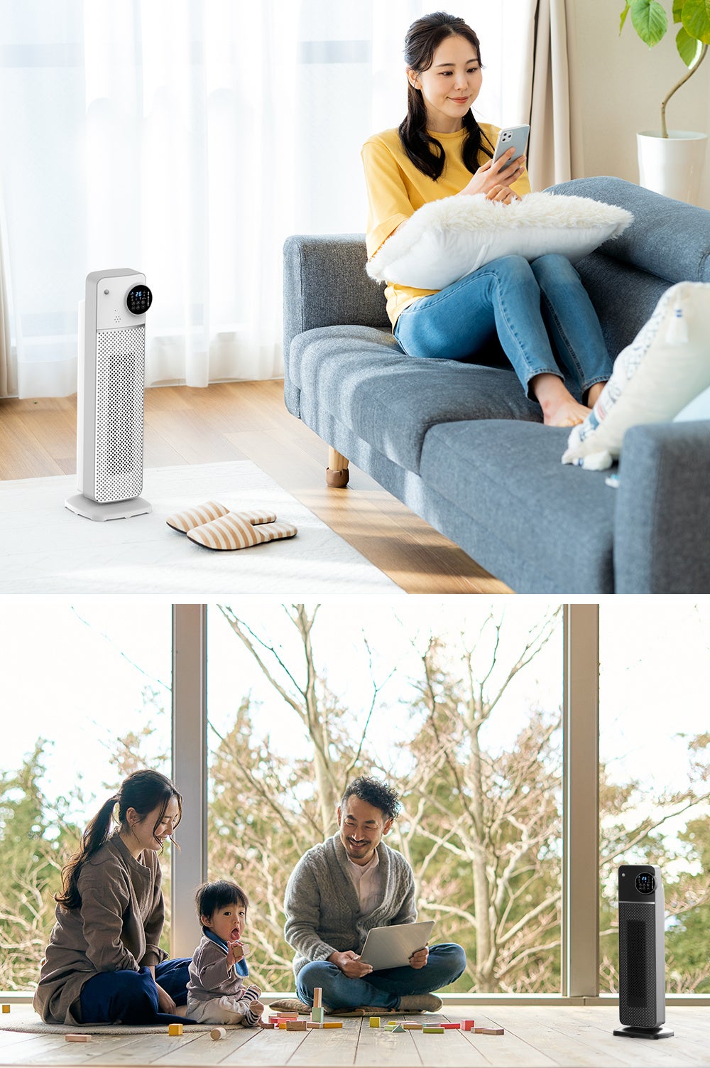 約2.4㎏軽量でコンパクトな本体は、移動や設置がしやすく、スマートな暖房であり、リビングはもちろん、キッチンや脱衣所などの狭い場所でスポット暖房として使うのに大人気です。