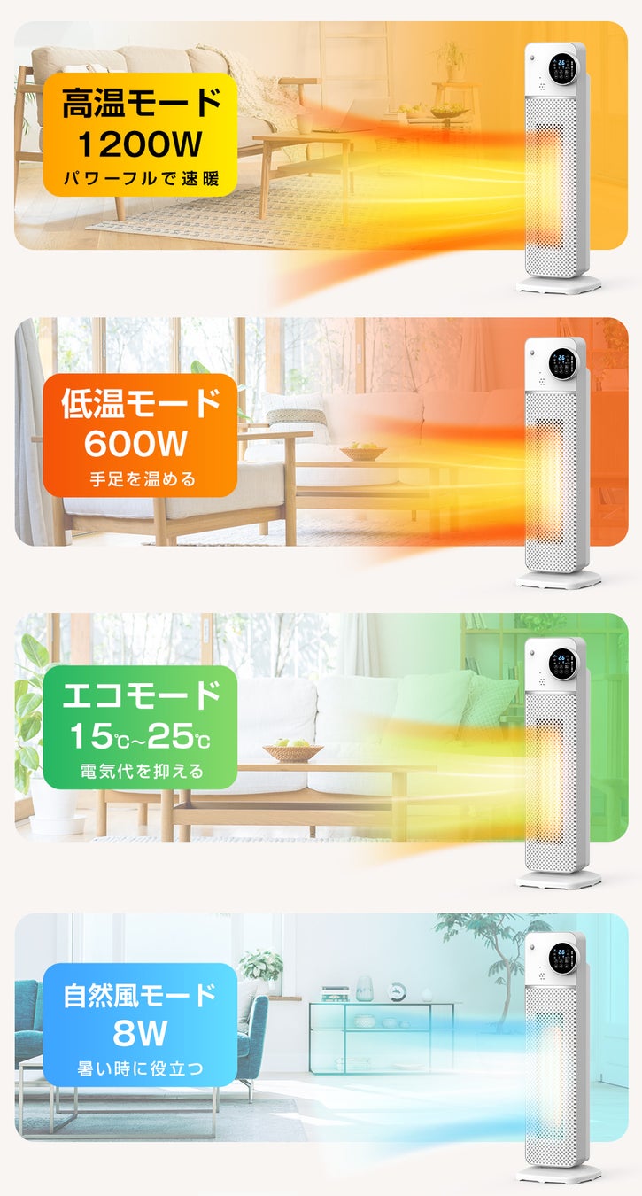 パワフルな暖房能力: 強力なセラミックヒーターは、瞬時にお部屋を暖め、寒冷な冬の日々に快適な温かさをもたらします。