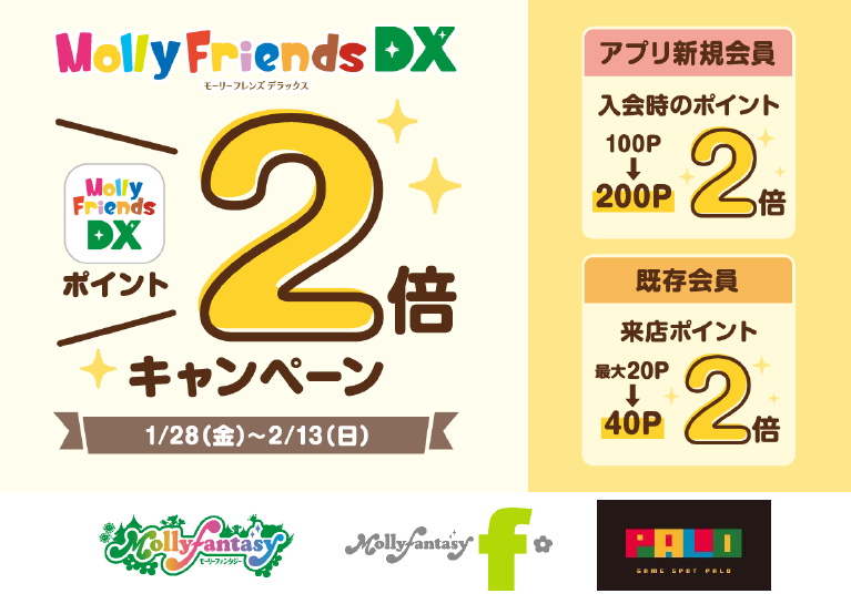 株式会社イオンファンタジー(本社:千葉県千葉市、代表取締役社長:藤原徳也、以下、当社)は、1月28日(金)から2月13日(日)までの期間、当社が運営する全国のアミューズメント施設「モーリーファンタジー」「モーリーファンタジーf」「PALO」の会員制度で、会員登録者数が39万人を突破した「モーリーフレンズDX(デラックス)」のアプリ会員新規入会時または来店ポイントが2倍になるキャンペーンを実施いたします。