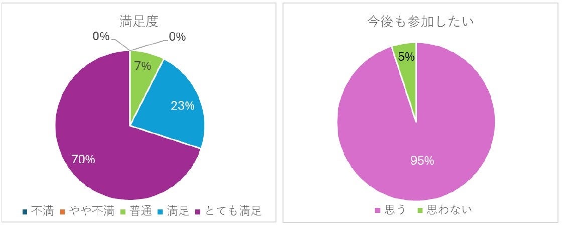 93%の方が「満足・とても満足」、同様のイベントへの参加についても95%の方が「参加したい」とご回答いただきました。