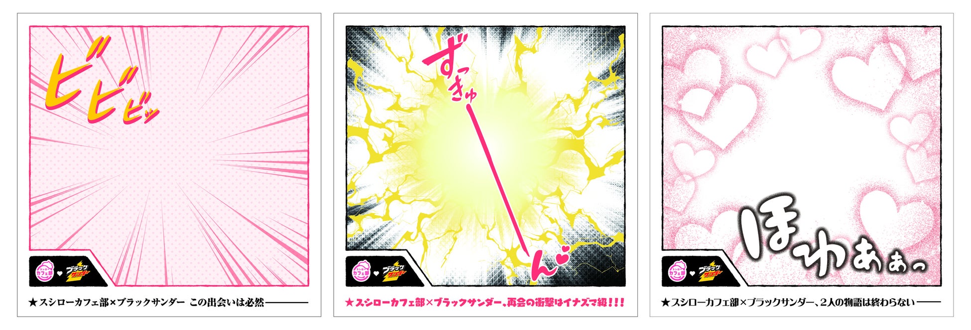 「ブラックサンダーと甘酸っぱい再会パフェ」は、チョコムースの上にスポンジ、いちごソース、マシュマロ等を入れ、ブラックサンダーをイメージしたチョコアイスの上に、ブラックサンダーに使用しているココアクッキーをかけた甘酸っぱい味わいのパフェです。パフェには「運命の恋もじ診断」が楽しめる限定ピックが付いており、診断を実施された方はコラボ限定グッズとブラックサンダー人気商品アソートが当たる抽選に参加することができます。さらに、ブラックサンダーとスシローカフェ部の定番人気No.1スイーツ(※2023年10月~2024年9月実績)「カタラーナアイスブリュレ」のコラボ商品が登場します。「ブラックサンダー相思相愛カタラーナ」は、ブラックサンダーのココアクッキーにチョコとバニラの2種類のカタラーナを重ね、表面をキャラメリゼした、なめらか食感とザクザク食感が楽しめるスイーツです。思わず写真を撮りたくなる、ブラックサンダーとスシローの再会を表現したコミック風シートが3種類の中からランダムで1枚付いてきます。