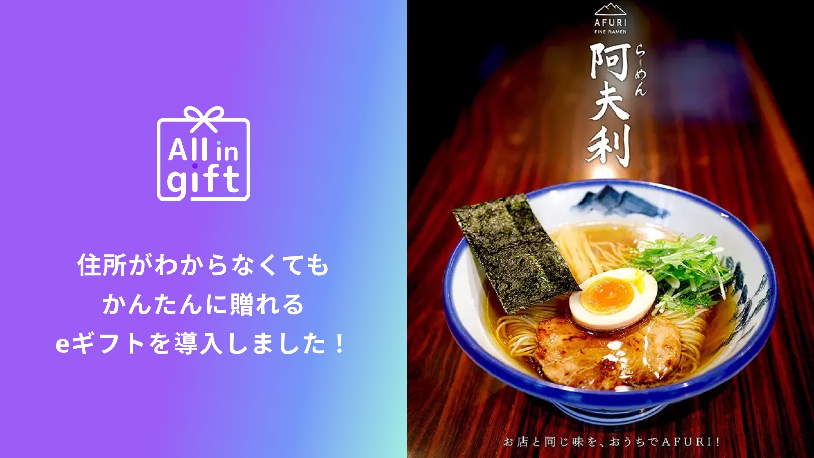 株式会社ハックルベリー(東京都世田谷区、代表取締役社長:安藤 祐輔、以下「ハックルベリー」)が提供する、通常ギフトはもちろん、住所を知らなくても贈れるeギフトにも対応したShopify(ショッピファイ)アプリ「All in gift」が素材の力を活かしたらーめん店「AFURI」さまのオンラインショップ( https://shop.afuri.com/ )に導入されました。