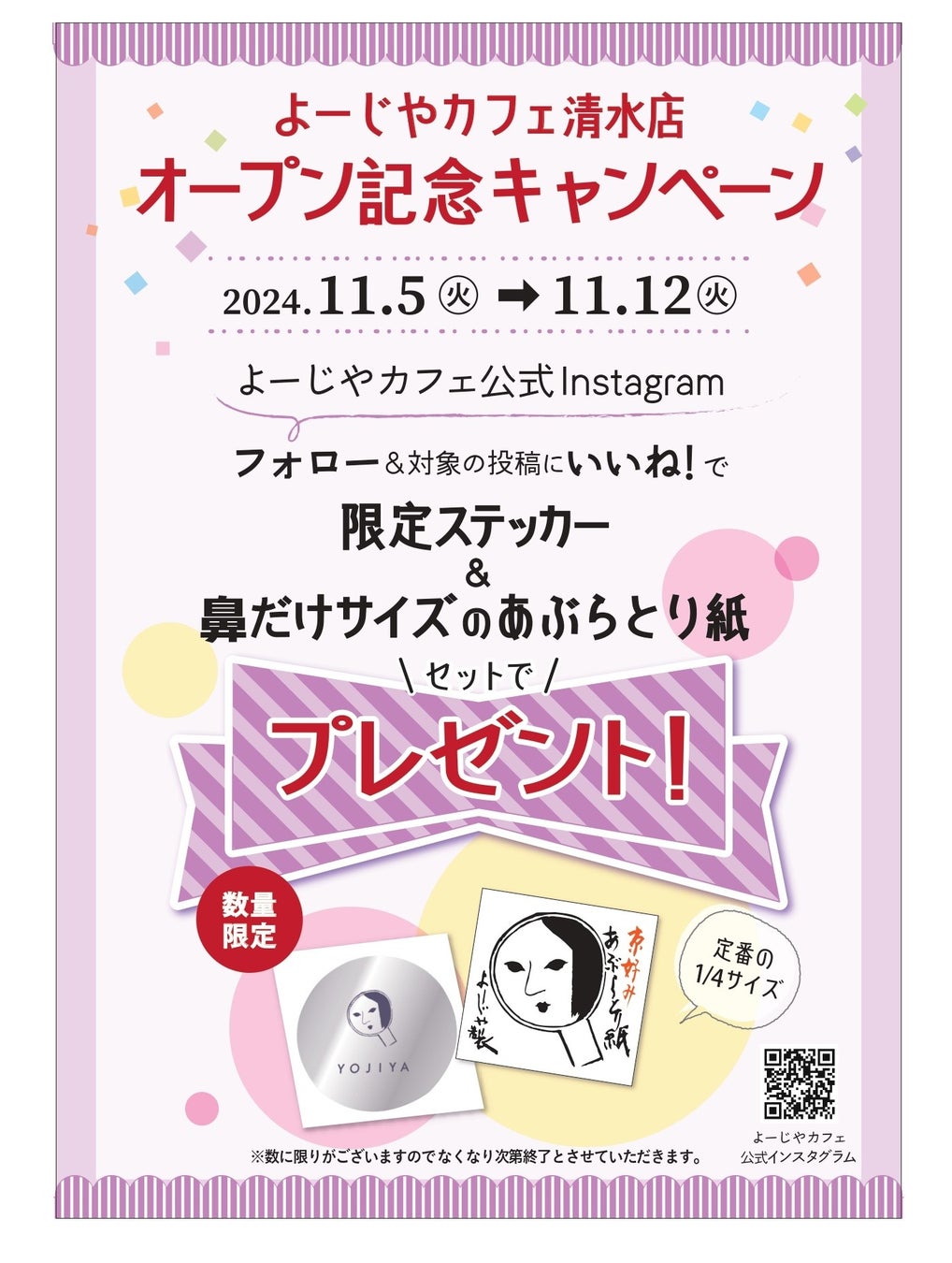 よーじやカフェ公式Instagram(@yojiyacafe_official)のフォローと対象の投稿にいいね!して、店舗スタッフに画面をご提示いただくと、限定ステッカー&通常の4分の1サイズの、「鼻だけサイズのあぶらとり紙」をセットでプレゼントいたします。