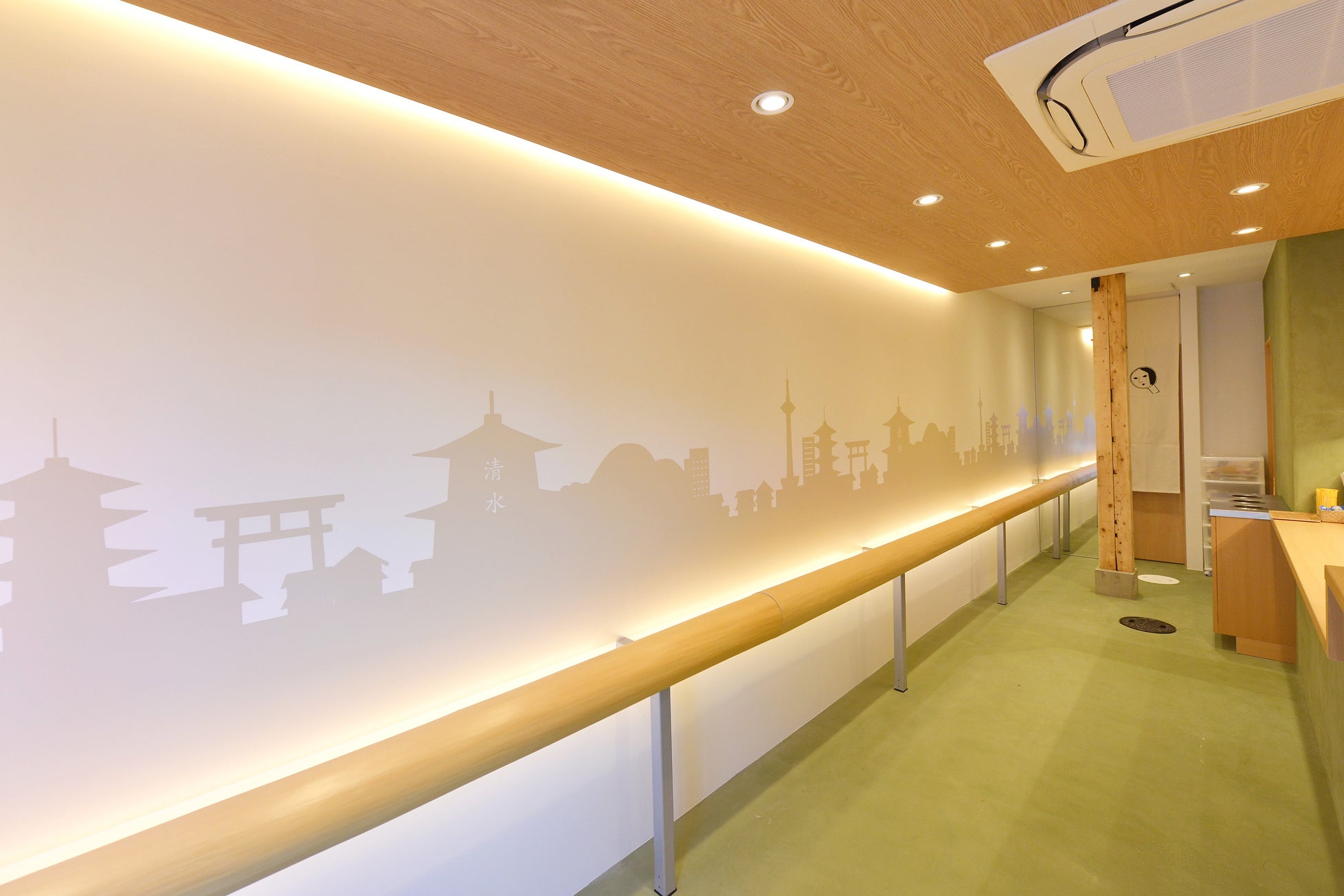抹茶色で温かみのある店内には、京都の街並みが描かれた壁紙も。完成したパフェやカプチーノと一緒に撮影をしていただけます。2軒先の肌ケアアイテムなどが購入できる「よーじや 清水店」と一緒に旅の思い出をつくりませんか。