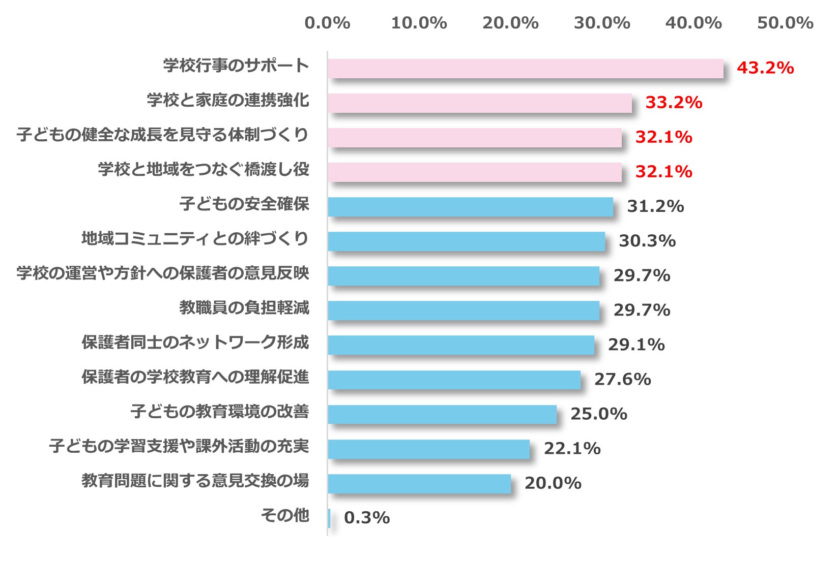 PTAが必要だと回答した保護者340名を対象に、その理由を調査しました。その結果、最多回答は「学校行事のサポート(43.2%)」、次に「学校と家庭の連携強化(33.2%)」、「子どもの健全な成長を見守る体制づくり(32.1%)」、「学校と地域をつなぐ橋渡し役(32.1%)」となりました。