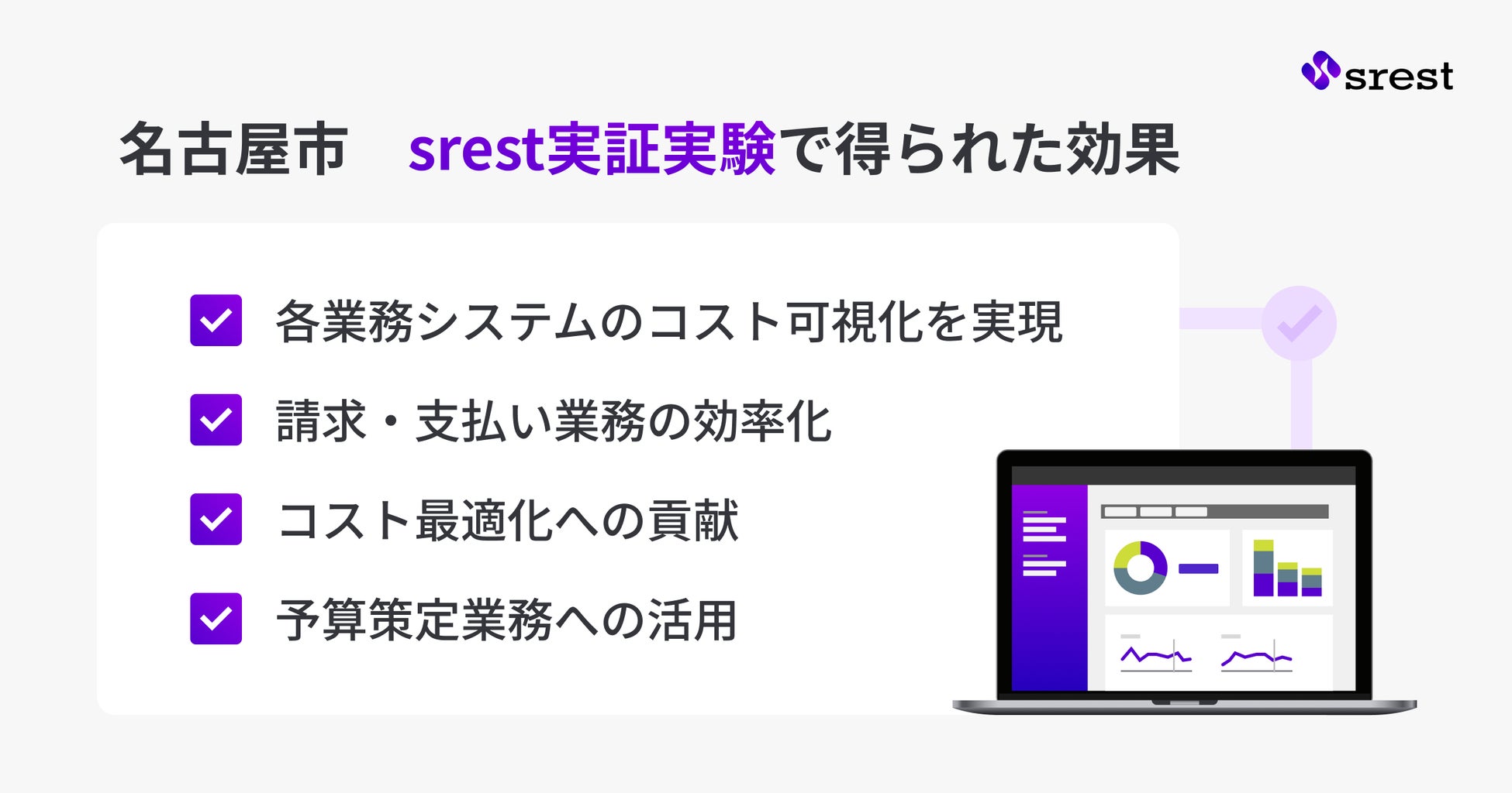 現在、名古屋市含め全国の自治体で、基幹業務システムをガバメントクラウドに移行する大規模プロジェクトが進行しています。期限が非常に短いため国や事業者に余力が無く、ダッシュボード構築や請求内訳確認といった運用足回りの整備が間に合っていません。そうした状況で、srestのようにSaaSで必要なサービスを提供いただけるのは非常ににありがたい事です。スタートアップ特有の小回りの良さもあり、今後の追加機能にも期待しています。