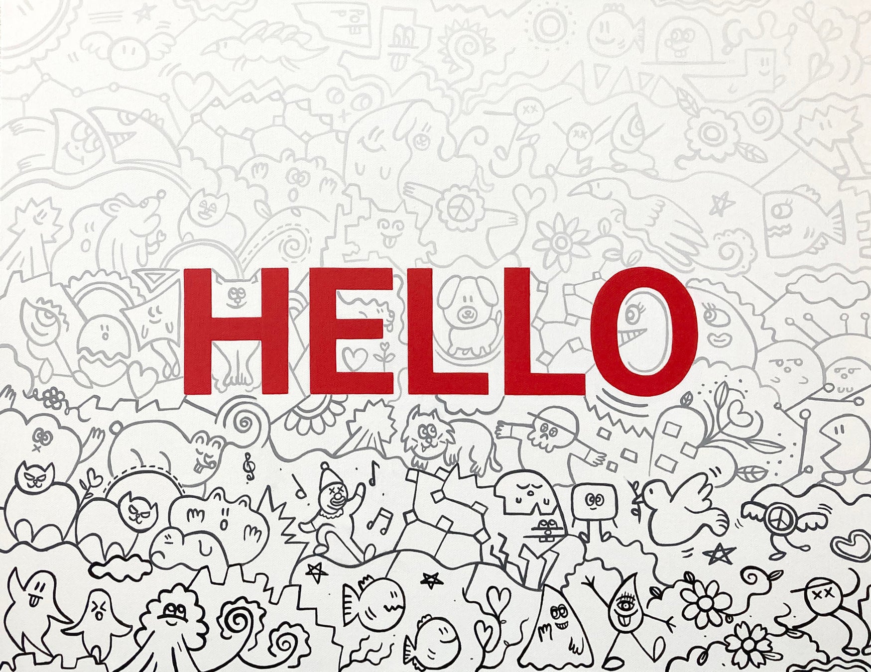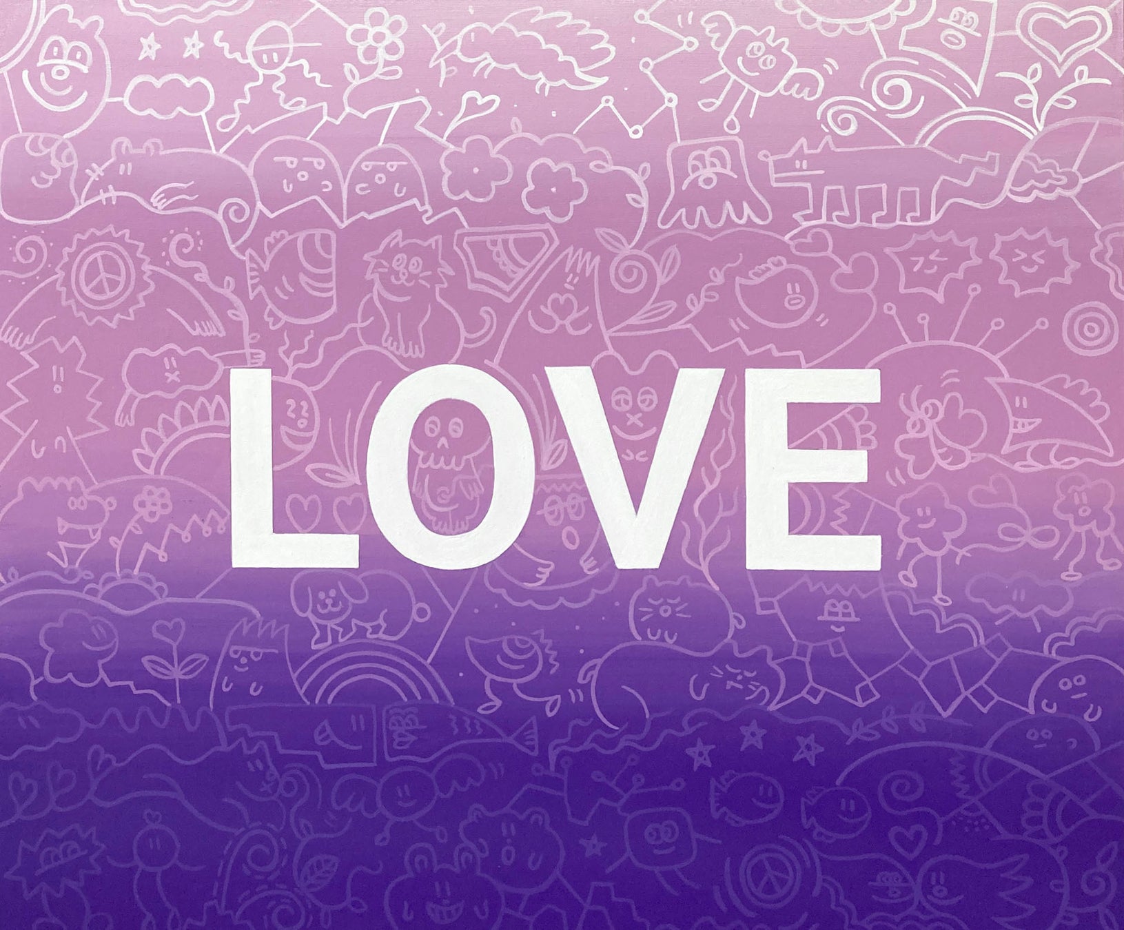 LOVE、 HELLOの文字が書かれた作品は、鑑賞者との心の繋がりを意識して生まれたシリーズです。作品の背景には様々な感情を持つ生き物たちの、愛情や楽しさを表す無邪気な様子を描いています。