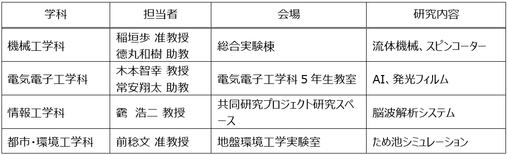 概要現地参加の希望者を対象に、各学科の代表教員より、実験室などの会場で次表の研究内容の説明及び研究機器の紹介を行いました。
