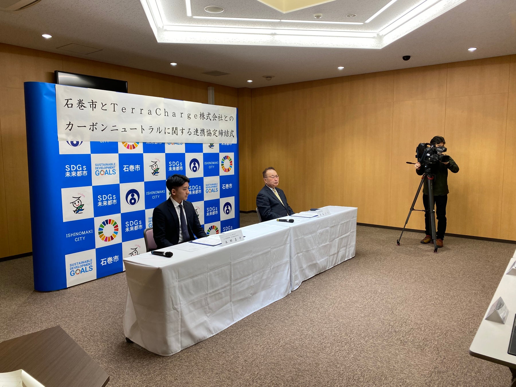また、協定の締結とEV充電器の設置・供用開始を記念し、石巻市長 齋藤 正美(さいとう まさみ)様、Terra Charge株式会社 営業部 自治体統括責任者 本郷 真平(ほんごう しんぺい)が出席し、「カーボンニュートラルに関する連携協定締結式」を執り行いました。