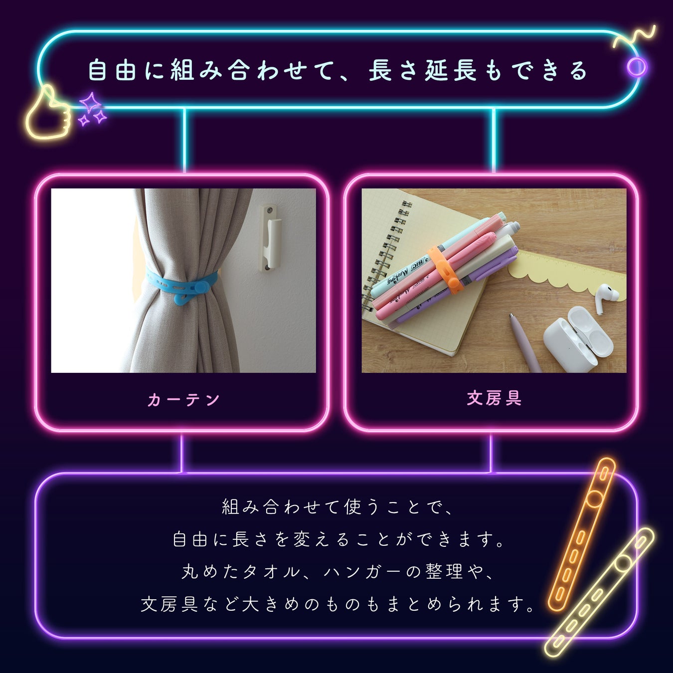 懐中電灯やモバイルバッテリーに巻いておけば、停電のときにもサッと取り出せて心強い存在に。