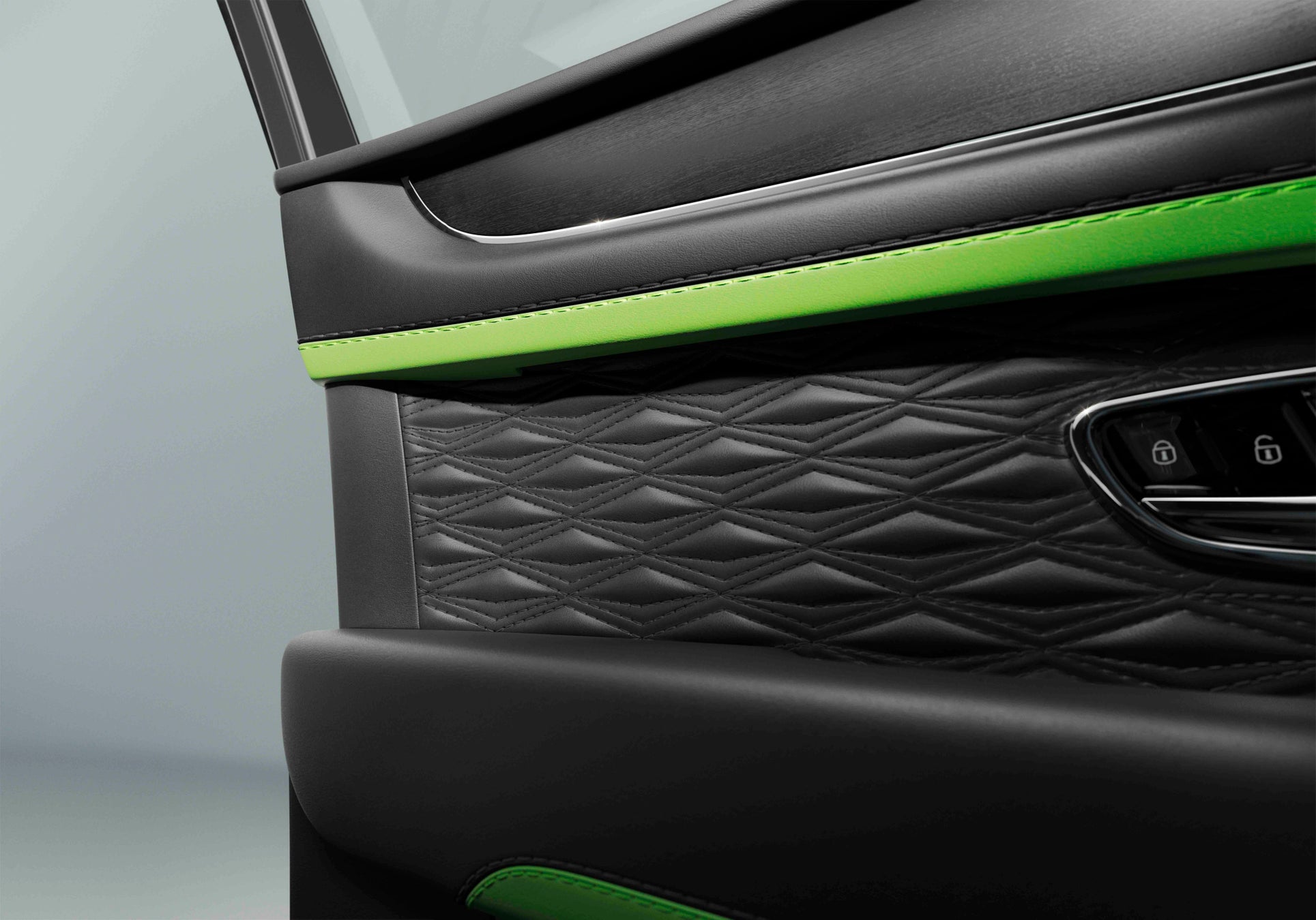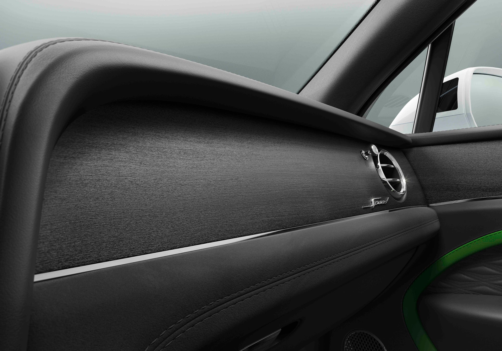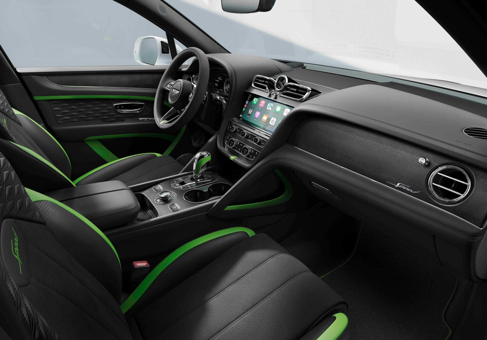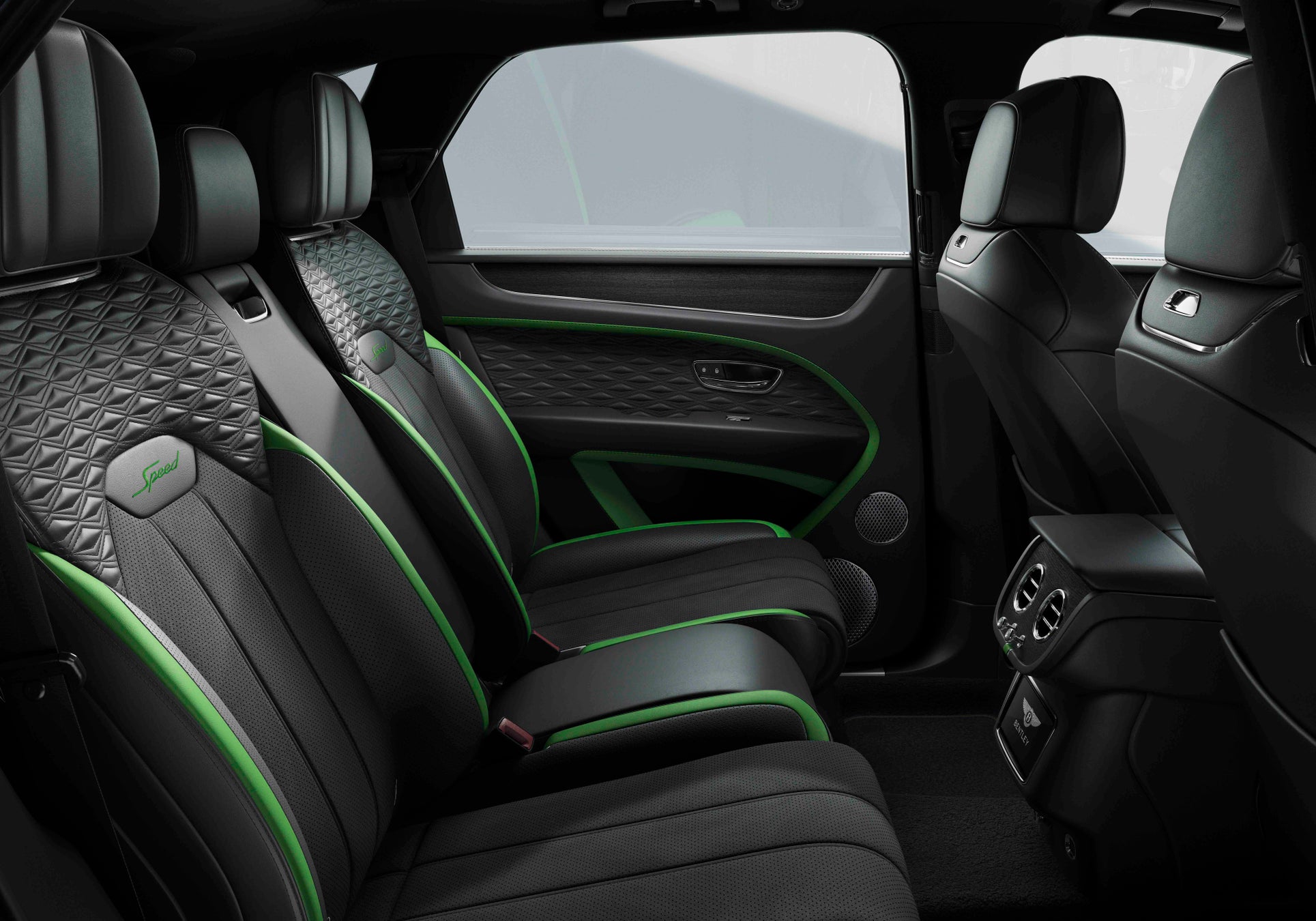 新型ベンテイガ スピードのインテリアは、唯一無二のパフォーマンスを物語るデザインに仕上げられています。標準装備として、スピード専用のドライバーインフォメーションディスプレイに加え、助手席側フェイシアおよびドアシルプレートにはSpeedバッジがあしらわれ、シート上部にはSpeedロゴの刺繍が施されています。ベントレーならではのブルズアイスタイルのエアベント、オルガンストップ、センターエアベントには、標準のクローム仕上げに加え、ダークティント仕上げも選択可能。シートショルダーパネル、ドアの内側、そして4座仕様ではリアシート背面にまで、新たに開発されたプレシジョン・ダイヤモンドキルトが採用され、繊細かつ立体的な美しさが空間を彩ります。カラーコーディネートには、スピード専用のカラースプリットが採用されており、落ち着きある濃色のセカンダリーレザーを基調に、シートの外周部やドアトリム、インストルメントパネル側面には、メインカラーが巧みにアクセントとして配されています。