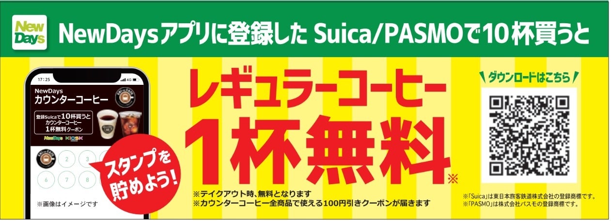 NewDaysアプリでは、アプリに登録したSuica・PASMOでカウンターコーヒーメニューを10杯買うと、100円のレギュラーコーヒーが1杯無料(※)になるキャンペーンを実施しております。この機会にぜひご登録ください。