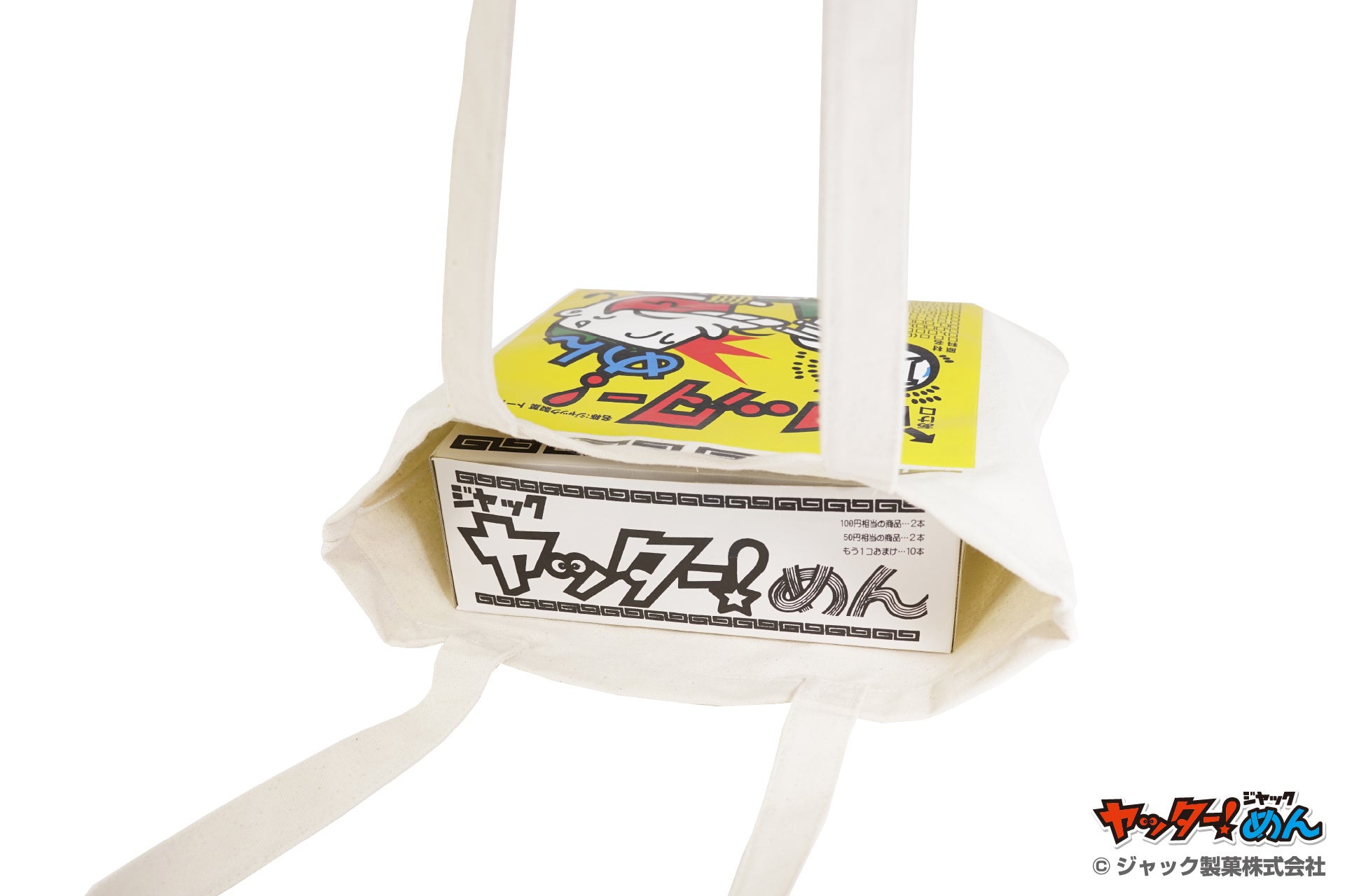特徴:駄菓子屋さんでお馴染みの「ヤッター!めん」がかわいいトートバッグに!しっかりとした帆布生地でA4サイズも収納可能。お買い物や学校・習い事などにもぴったりなトートバッグ。「ヤッター!めん」を箱買いしてもスッポリ収まるので大人買いも安心です。