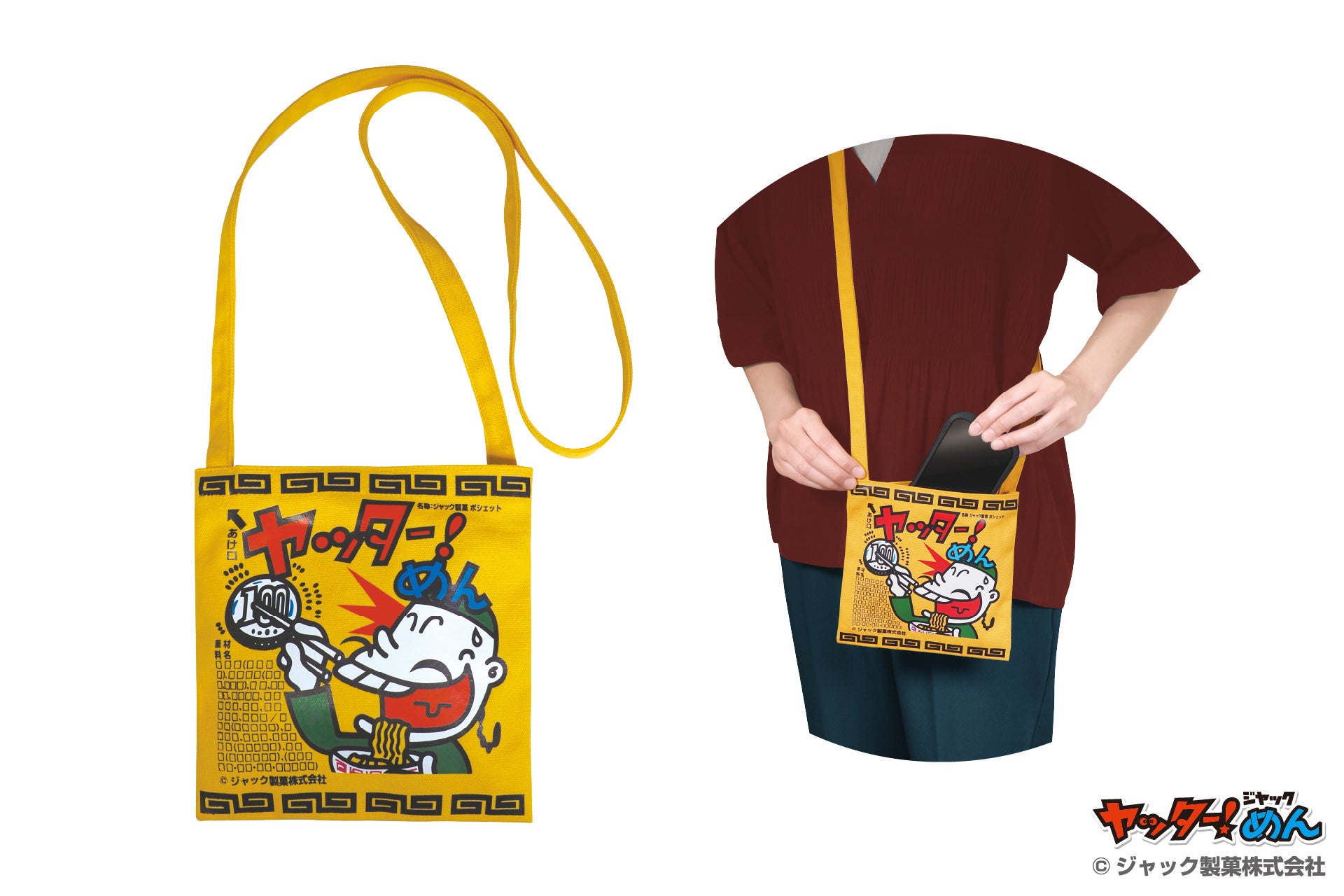 特徴:駄菓子屋さんでお馴染みの「ヤッター!めん」がかわいいポシェットに!しっかりとした帆布生地で財布やスマホを入れて、ふらっと出かけるのに丁度よいサイズ感。「ヤッター!めん」を約50個持ち歩けます。