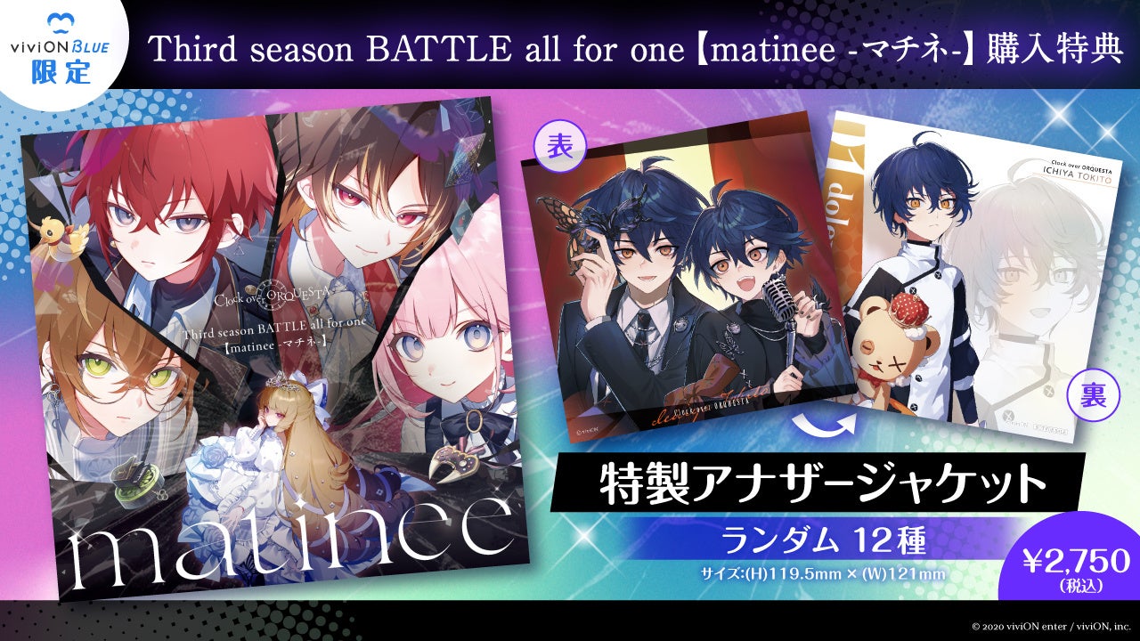 「Third season BATTLE all for one 【matinee -マチネ-】」の予約開始を記念して、公式ECショップ『viviON BLUE』(https://vivionblue.com/)でノベルティフェアを期間限定で開催いたします。