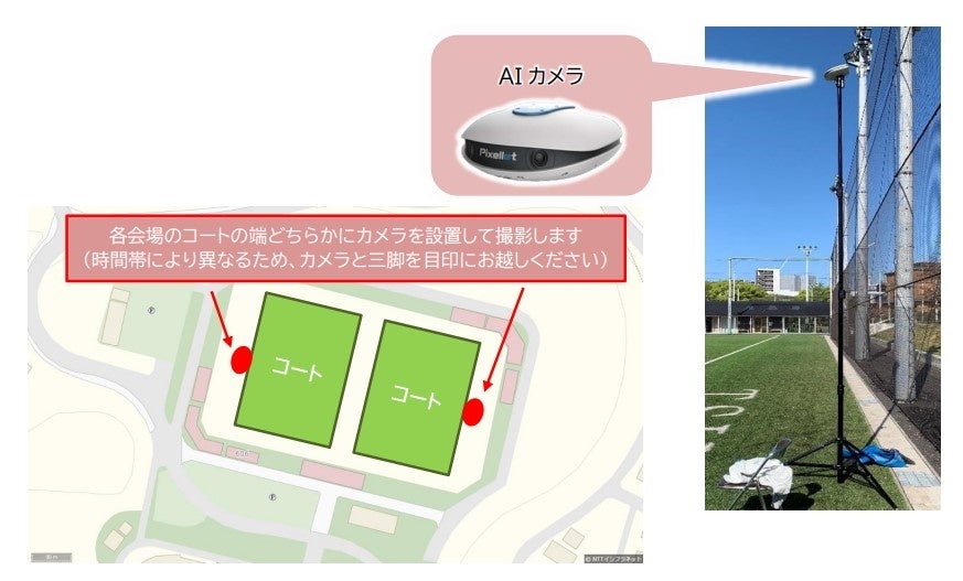 AIカメラは、いずれの会場もコートの端部に設置して撮影を行います。取材を希望される場合には、下図のカメラと三脚を目印にお越しいただき、付近にいるスタッフへお声がけください。