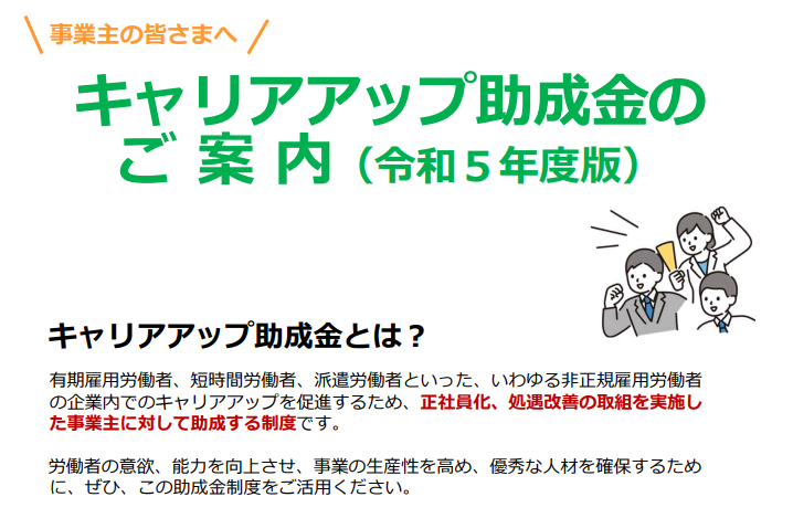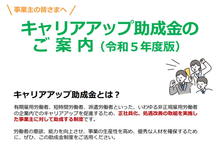 厚生労働省が実施しているキャリアアップ助成金は、 非正規雇用労働者の企業内でのキャリアアップを促進することを目的として、正社員化、処遇改善の取組みを実施した事業主に対し、助成金を支給する制度 です。