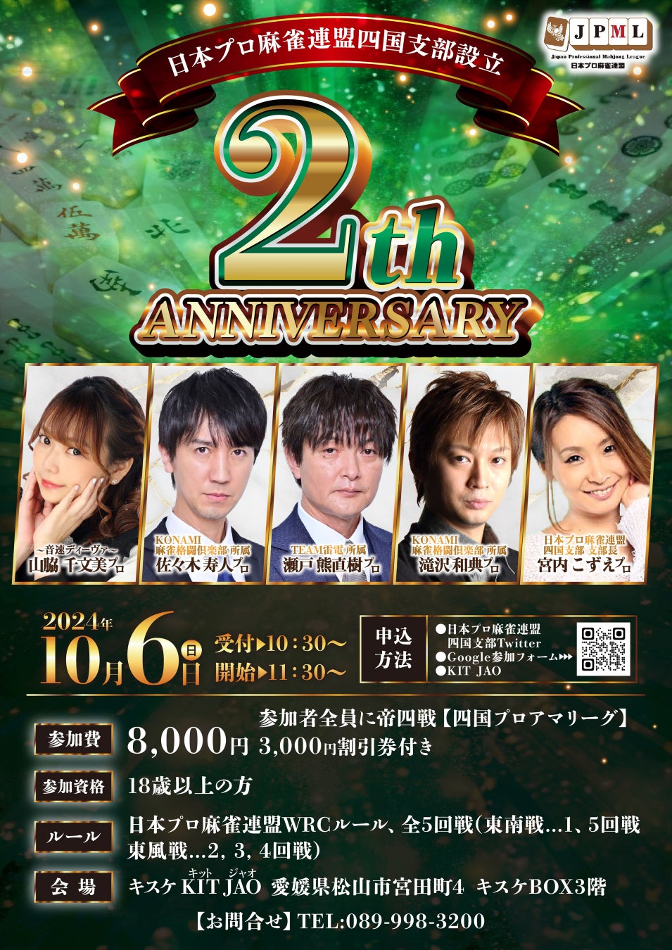 2022年5月に設立された日本プロ麻雀連盟四国支部が、四国の麻雀ファンとともに、設立2周年を祝う大会。Mリーガーを含む5名のゲストプロも参加!