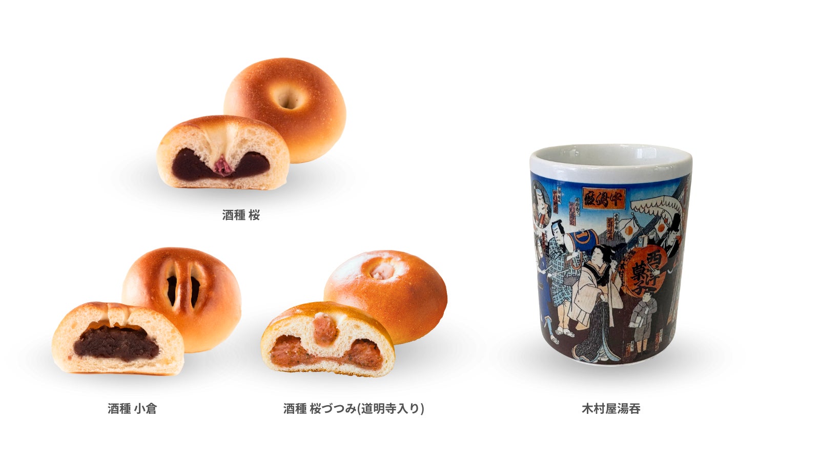 ①酒種あんぱん(桜、小倉、桜づつみ(道明寺入り))とオリジナルグッズ「木村屋湯吞」のセットを限定発売