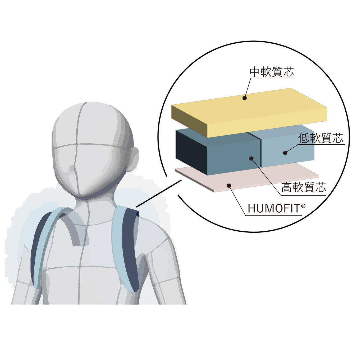 ベルトの内部に配置した3種類の異なる芯材の働きで荷重を分散させ、肩にあたる部分に体温を感知してフィットするHUMOFIT®(ヒューモフィット)を組み合わせることにより、荷重分散された状態で使用者の身体にピッタリ沿うように設計された特許技術です。