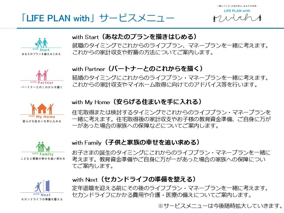 「LIFE PLAN with」は、お客さまの「人生」に寄り添い、「ライフプラン」を実現するために、その時々の暮らしに応じたマネープランをアドバイスするサービスです。