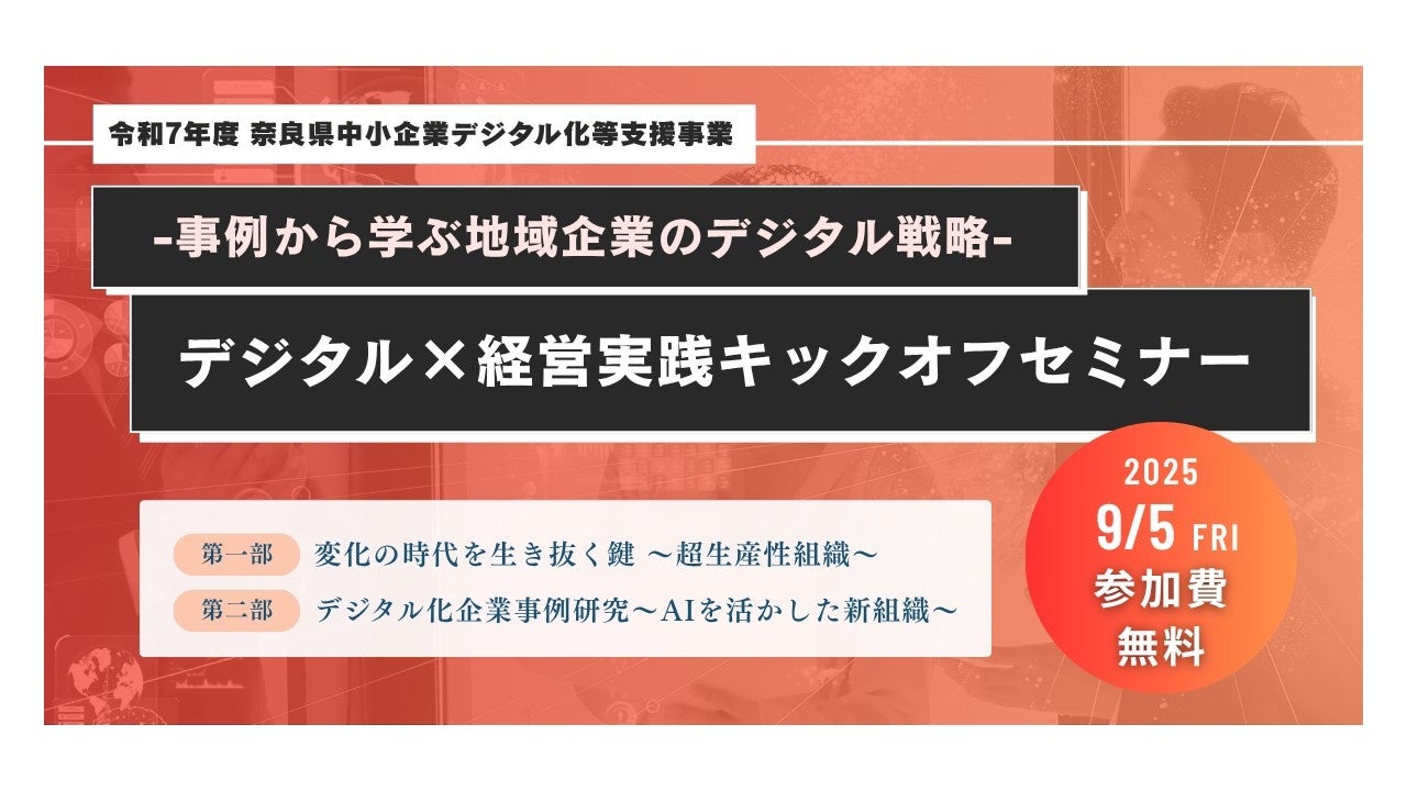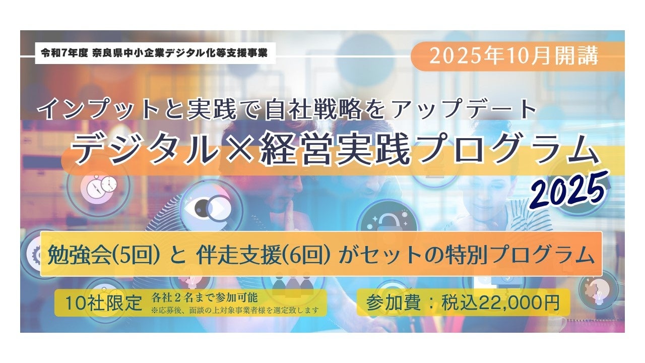 奈良県では、県内の中小企業の経営力強化と成長支援を目的に、「デジタル×経営実践プログラム」を開催します。ご関心のある方はお申し込みください!