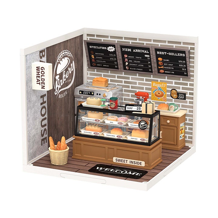 シックなカラーでまとまった「アメリカンベーカリー」は、“クリエイターシリーズ”のベーカーズの柄違い。小物などは同じですが、壁紙や床の色などが違うことで、全く異なる雰囲気のミニチュアハウスになっています。奥にあるオーブンと、手前の突き出し看板は光る仕様です。