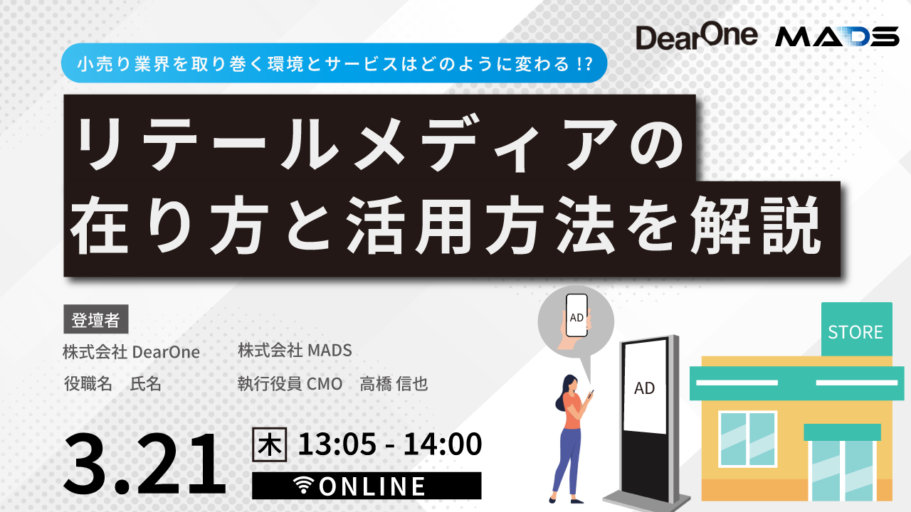本ウェビナーは、小売を中心とした企業の公式のアプリ開発事業や小売アプリへの横断的な広告配信を可能にする「ARUTANA」を展開する株式会社DearOneと、日本最大級のドラッグストアのデジタルOOHネットワークを保有する株式会社MADSが、リテールメディアの在り方や、どのように活用すべきか、最新のトレンドを踏まえ解説します。