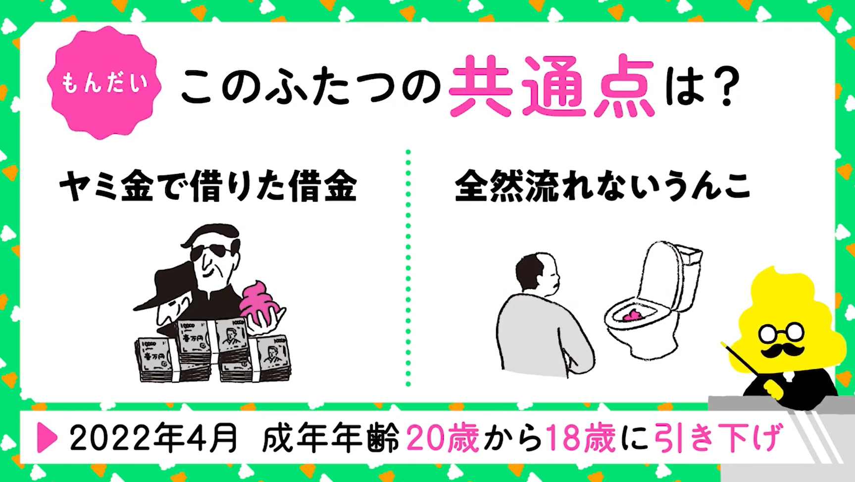 株式会社文響社(所在地:東京都港区、代表取締役:山本周嗣)はこのたび金融庁とコラボレーションし、金融庁公式YouTubeチャンネルにて、あらたに新成人になる方へ向けた、闇金融などの金融トラブル被害を防止するための啓発動画『新成人向け うんこクイズ』を公開いたしました。