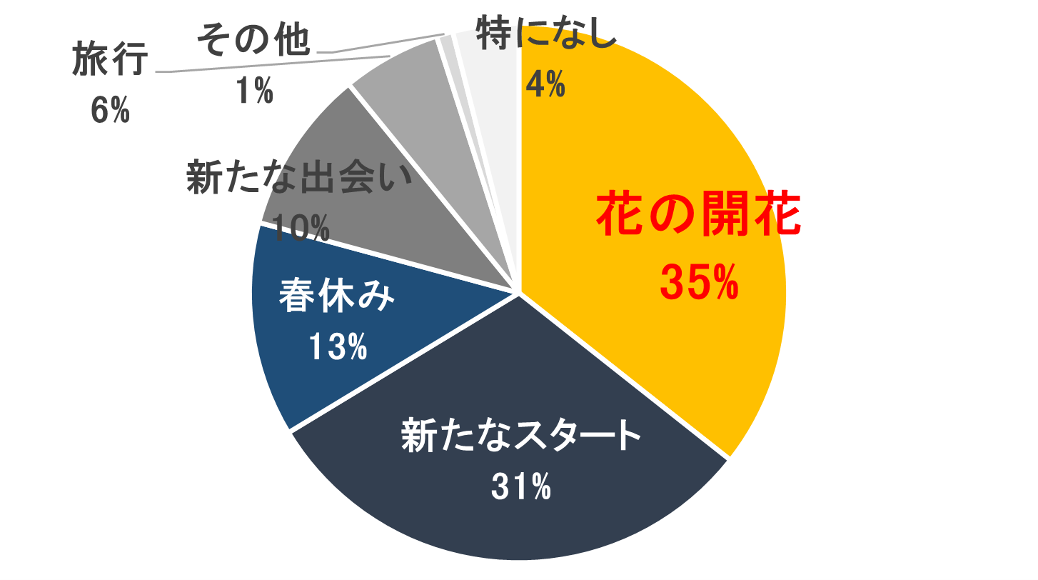 日本人にとっての春のイメージとして最も回答が多かったのは「花の開花」(35%)でした。次いで「新たなスタート」(31%)、「春休み」(13%)がランクイン。また、約65%の日本人がこの季節に旅行に行くことを検討しており、日本人にとって「花見旅行」は新しい季節の春を感じる最適な方法なのかもしれません。