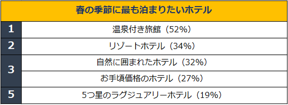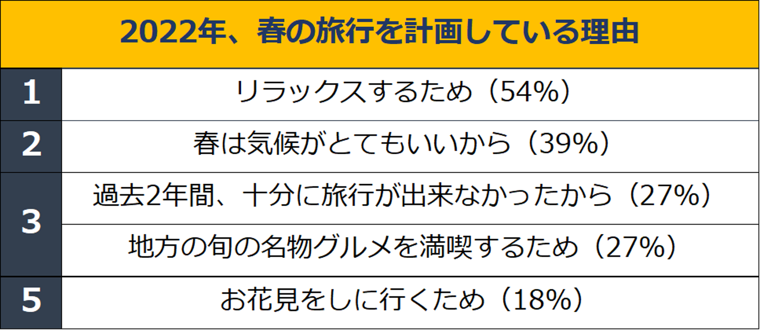 調査の結果から、人々は春に旅行に行きたい理由として、リラックスするため(54%)、春は気候がとてもいいから(39%)、過去2年間十分に旅行が出来なかったから(27%)を挙げており、新しい発見や新しい場所を訪れたりすることを恋しがっていることが分かりました。行きたい旅行先としてTOPに上がったのは京都、次いで沖縄でした。家族や友人との旅行が理想と答える人が多い中、約8割の日本人は春の旅行にかける予算は10万円以下で、夏の旅行と同程度という結果となりました。最も予算を使いたいと思っているものは「宿泊」であり、泊まりたい宿泊施設は、理想の花見旅行が実現できる「温泉のある旅館」「リゾートホテル」「自然の中にあるホテル」の順で多い回答となりました。