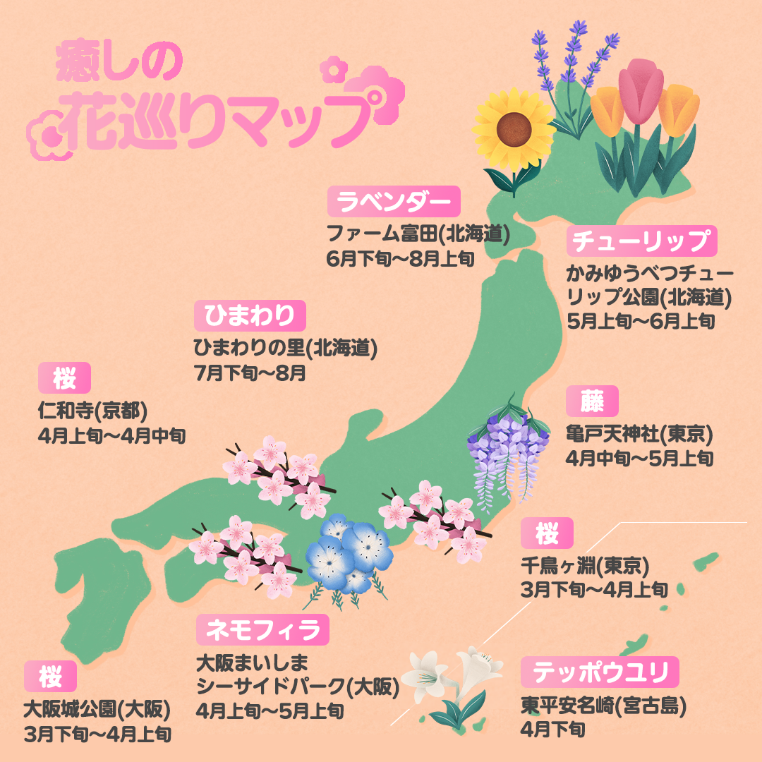 | 北海道 | チューリップ: かみゆうべつチューリップ公園 ラベンダー:ファーム冨田 ひまわり:ひまわりの里 |